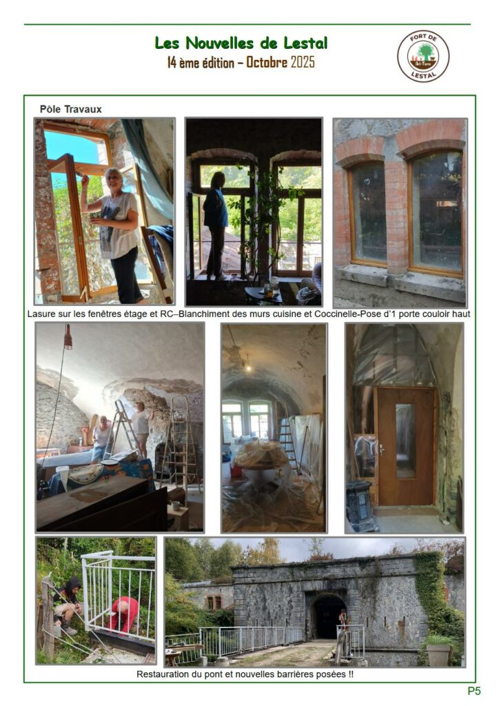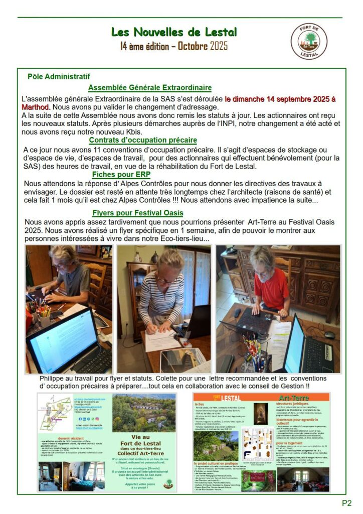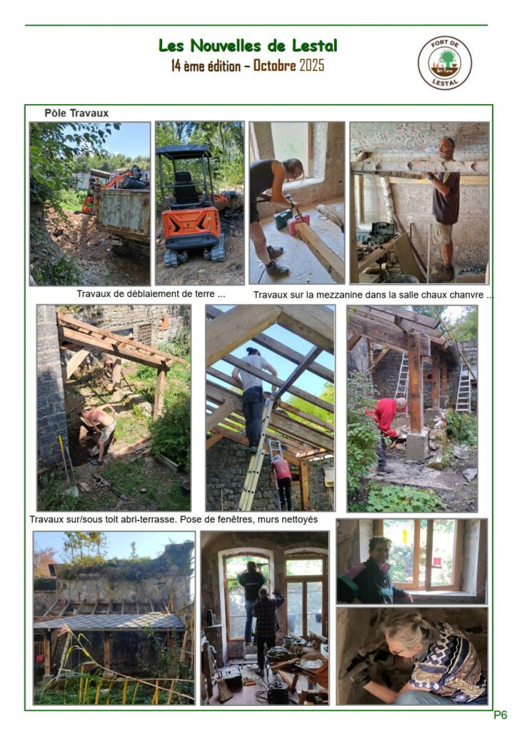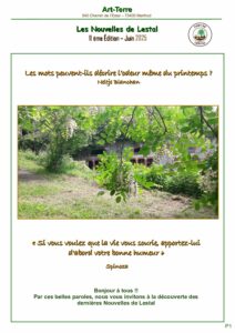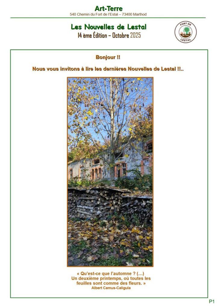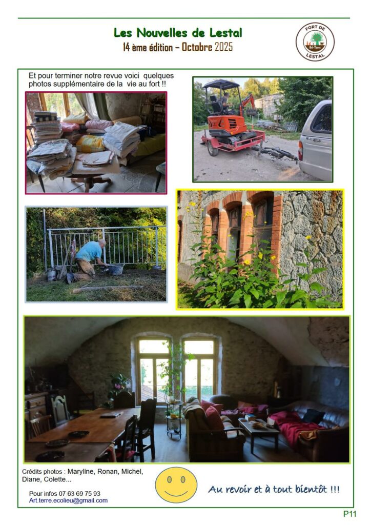 Chaque mois, Colette, notre Présidente à l’origine du projet rédige « LES NOUVELLES DE LESTAL ». Elle détaille l’avancée des travaux, les animations et les moments de détente entre « les art-terriens ». Le tout illustré par des photos réalisées par ses soins ou les adhérents et même les photographes de passage