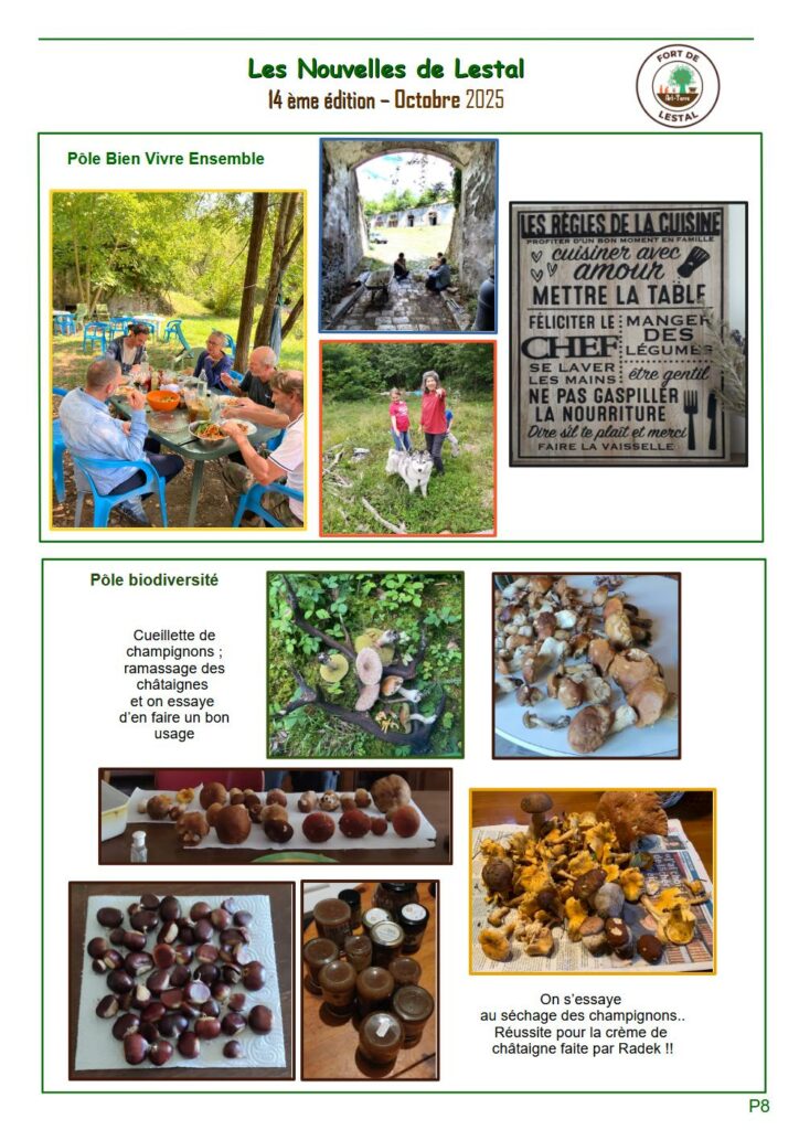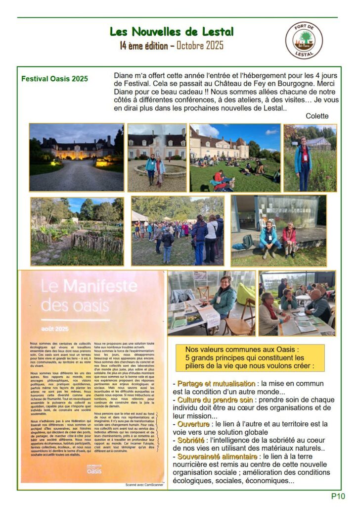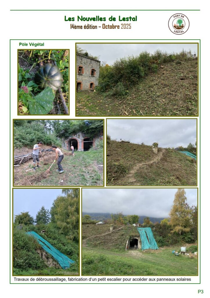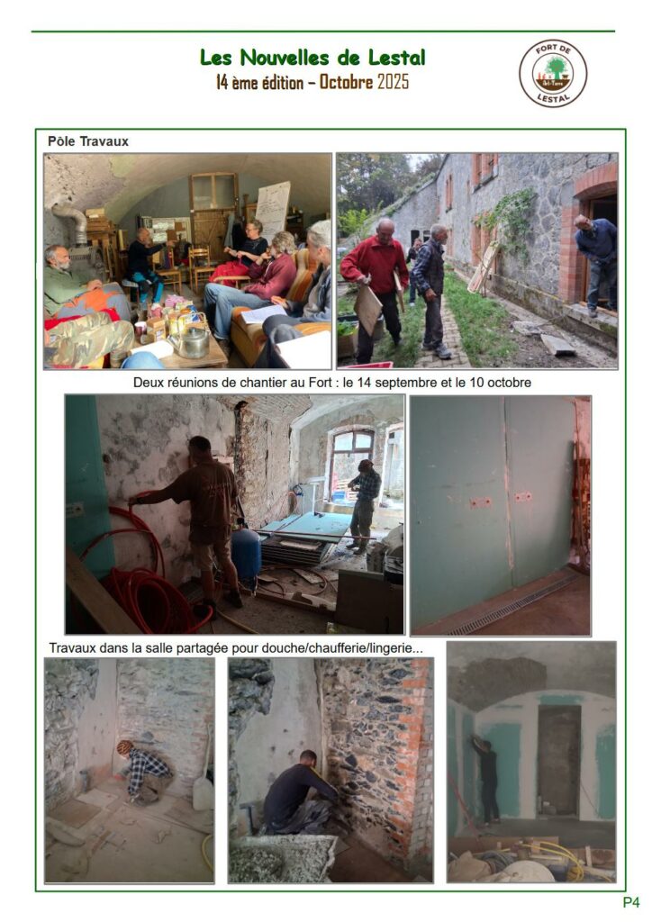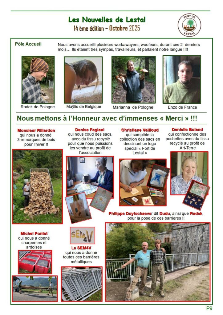 Chaque mois, Colette, notre Présidente à l’origine du projet rédige « LES NOUVELLES DE LESTAL ». Elle détaille l’avancée des travaux, les animations et les moments de détente entre « les art-terriens ». Le tout illustré par des photos réalisées par ses soins ou les adhérents et même les photographes de passage